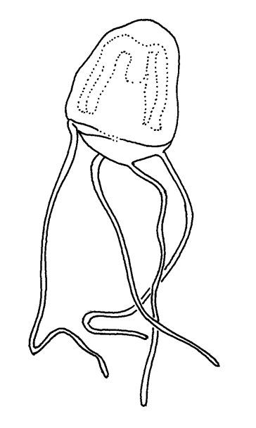 Carukia barnesi is a box jellyfish that lives in the open sea and can be found at different water depths. It is only through strong currents that they are sometimes carried in large swarms into coastal waters. They can be encountered in the outer reefs of the Great Barrier Reef, and less often directly off the beach. As is characteristic for box jellyfish, the bell is more or less square in shape. There is a tentacle attached to each of the 4 lower corners. Alone due to its size it is unlikely to be mistaken for Chironex fleckeri or Chiropsalmus quadrigatus. Its bell is roughly the size of the distal joint of a thumb (diameter approx. 2.5 cm). Unlike in the larger box jellyfish, the nematocysts, which are what makes the animals dangerous for humans, are not located on the tentacles but rather on the bell.