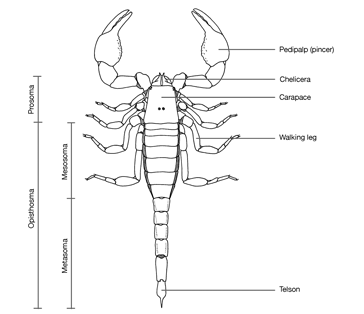 Fig. 4.33: Morphology of scorpions (a, b adapted from Keegan 1980).